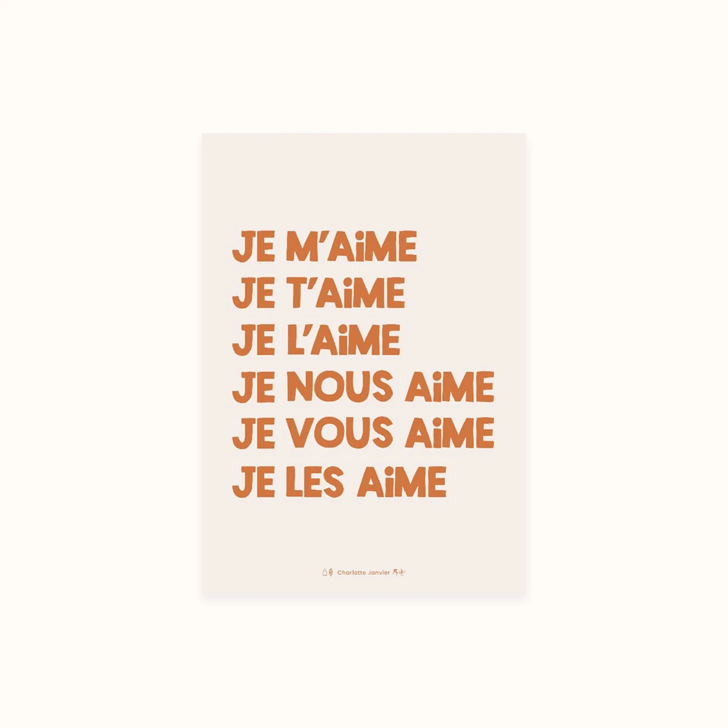 Je m’aime, je t’aime, je l’aime. Et vous, vous l’aimez cette jolie illustration de Charlotte Janvier ? L’affiche est vendue dans une enveloppe en papier recyclé avec une carte à planter !