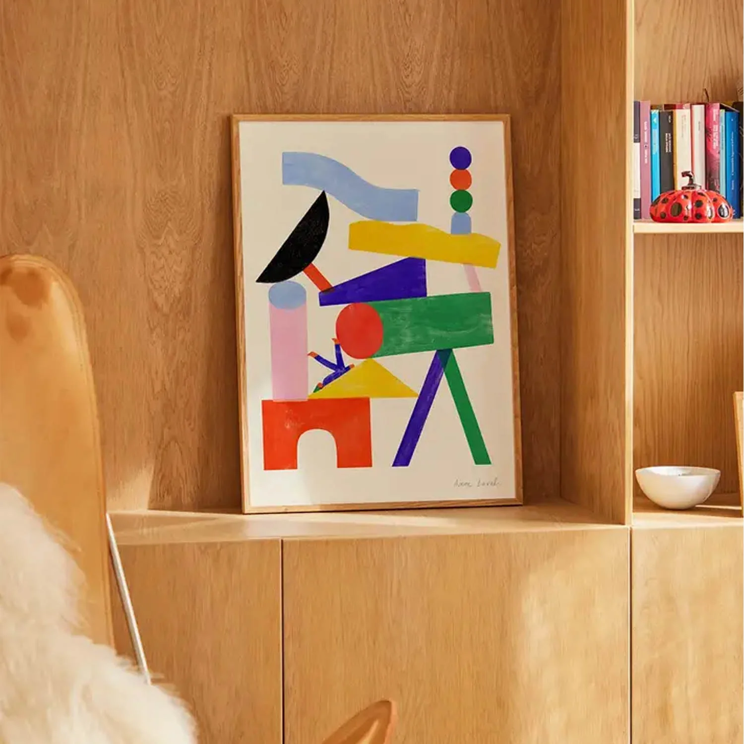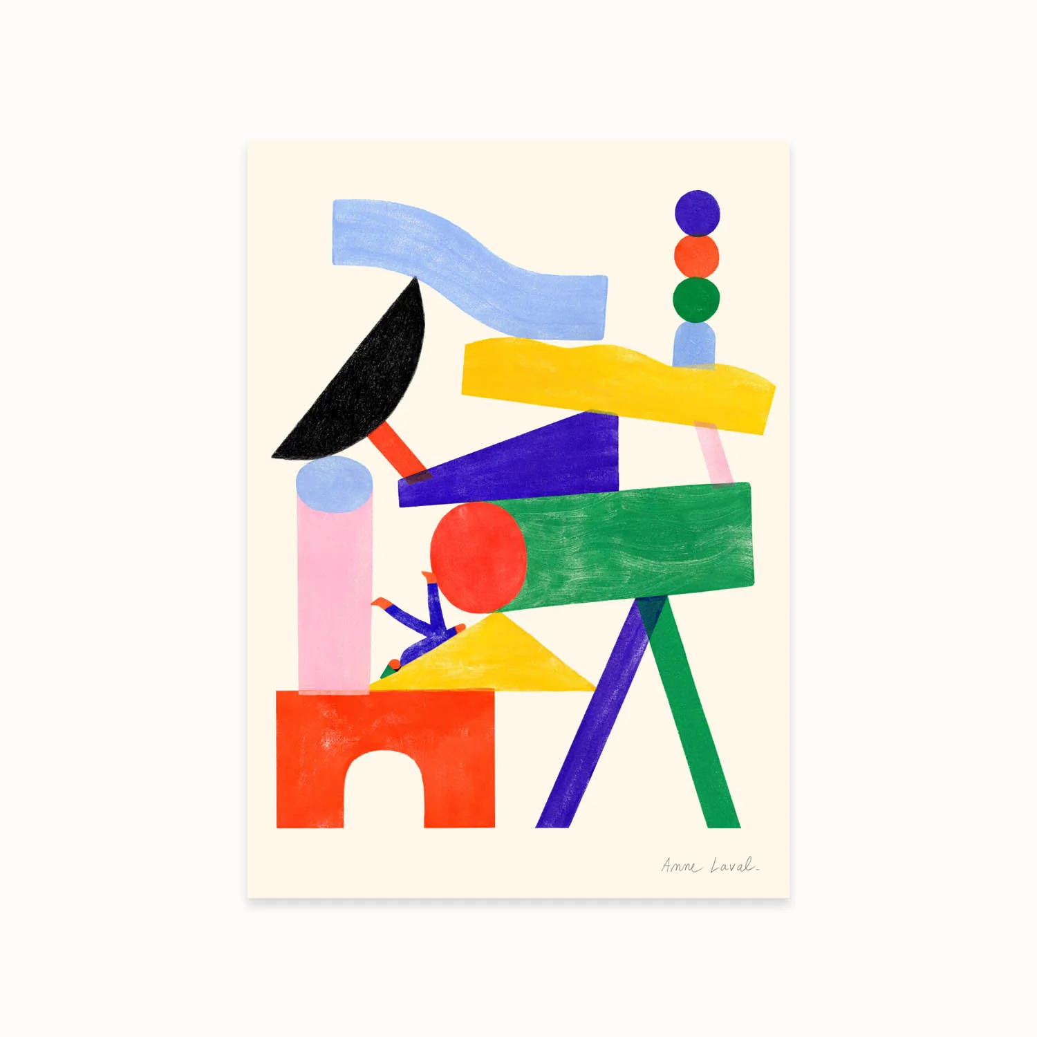 L’affiche « Jouer » de l’artiste française Anne Laval invite petits et grands à s’amuser. Créée à partir d’un mélange de formes estampées à la gouache et de détails au pastel, une seule figure trône dans un univers de couleurs et de formes. Laval a transformé de simples blocs de construction en un paysage prêt à être exploré. L‘affiche s’intègrera dans n’importe quel espace de la maison en apportant une touche colorée et ludique.
