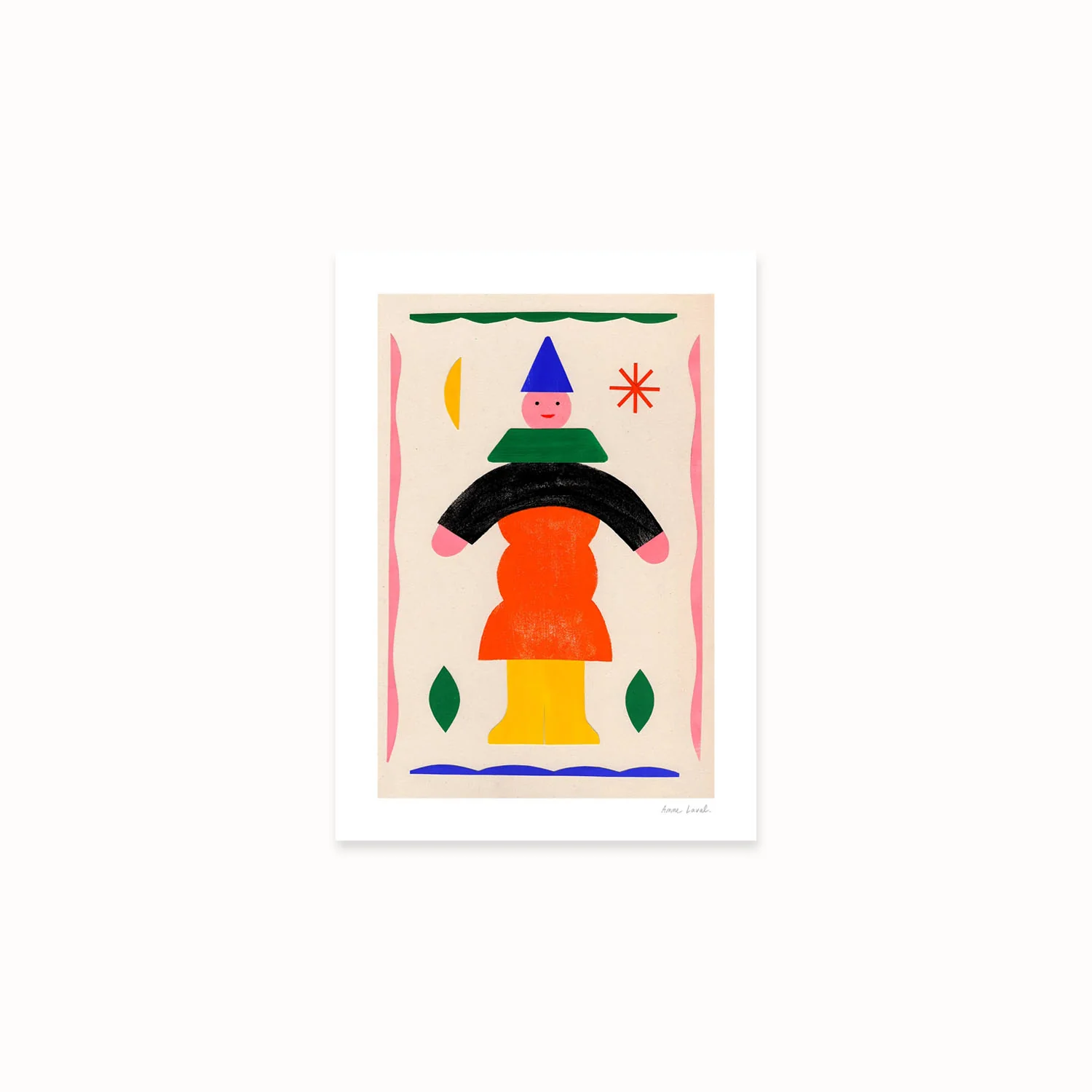 Cette oeuvre de l’illustratrice française Anne Laval est réalisée à partir de découpages, de gouache et de pastels. Elle représente un pantin ludique composé de formes géométriques simples, coiffé d’un haut-de-forme bleu éclatant. Une œuvre graphique et poétique qui apporte une touche d’originalité et de fantaisie à votre décoration ou à la chambre des enfants.