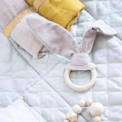 Matière : coton issu de l’agriculture biologique et tissu éponge, anneau en bois