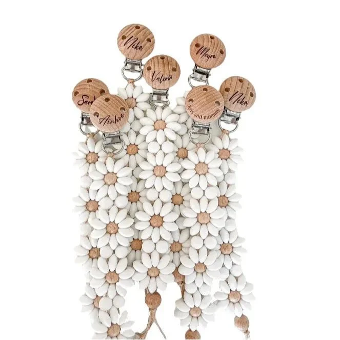 Conçue à la main dans des tons naturels, elle garde la sucette à portée tout en apaisant les gencives grâce à ses perles souples et sa texture veloutée.