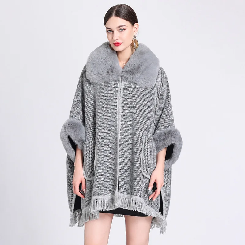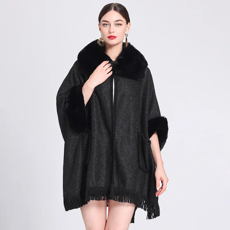 Cette élégante cape à franges est conçue pour vous offrir confort et style. Le col en fausse fourrure ajoute une touche de luxe, tandis que les manches sont subtilement décorées pour un look raffiné. Sa coupe ample et ses poches pratiques en font une pièce polyvalente parfaite pour affronter les journées fraîches. Disponible en plusieurs coloris, cette cape poncho est l’accessoire idéal pour sublimer vos tenues tout en vous gardant au chaud. Ne laissez pas le froid vous arrêter, commandez dès maintenant cette cape tendance pour un hiver avec élégance et confort !