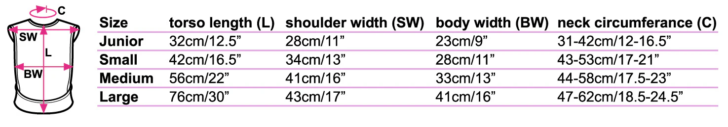 Size Torso Length Should Width Body Width Neck Circumference Kids/Junior 32cm/12.5″ 28cm/11″ 23cm/9″ 31-42cm/12-16.5″