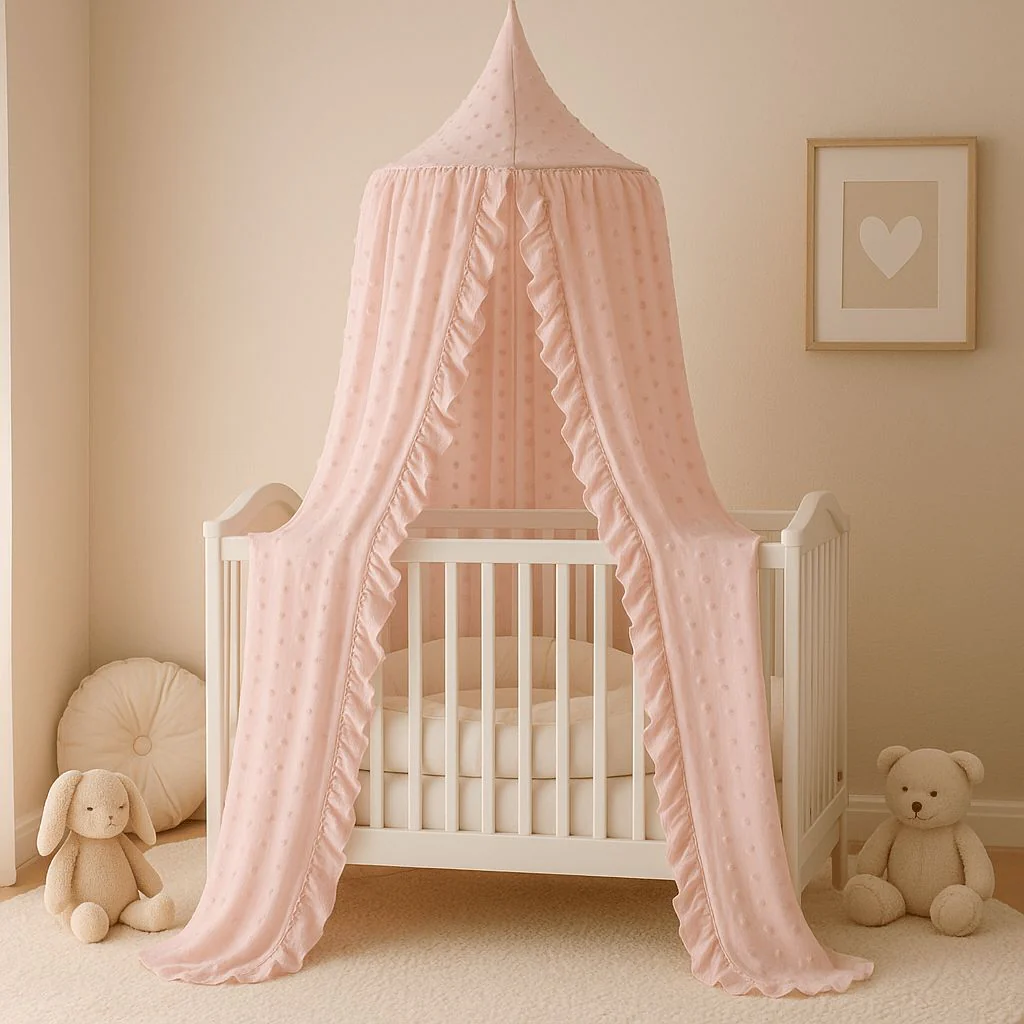 Avec ses volants élégants et ses petits pois délicats, notre ciel de lit transforme instantanément une chambre ordinaire en un lieu magique.