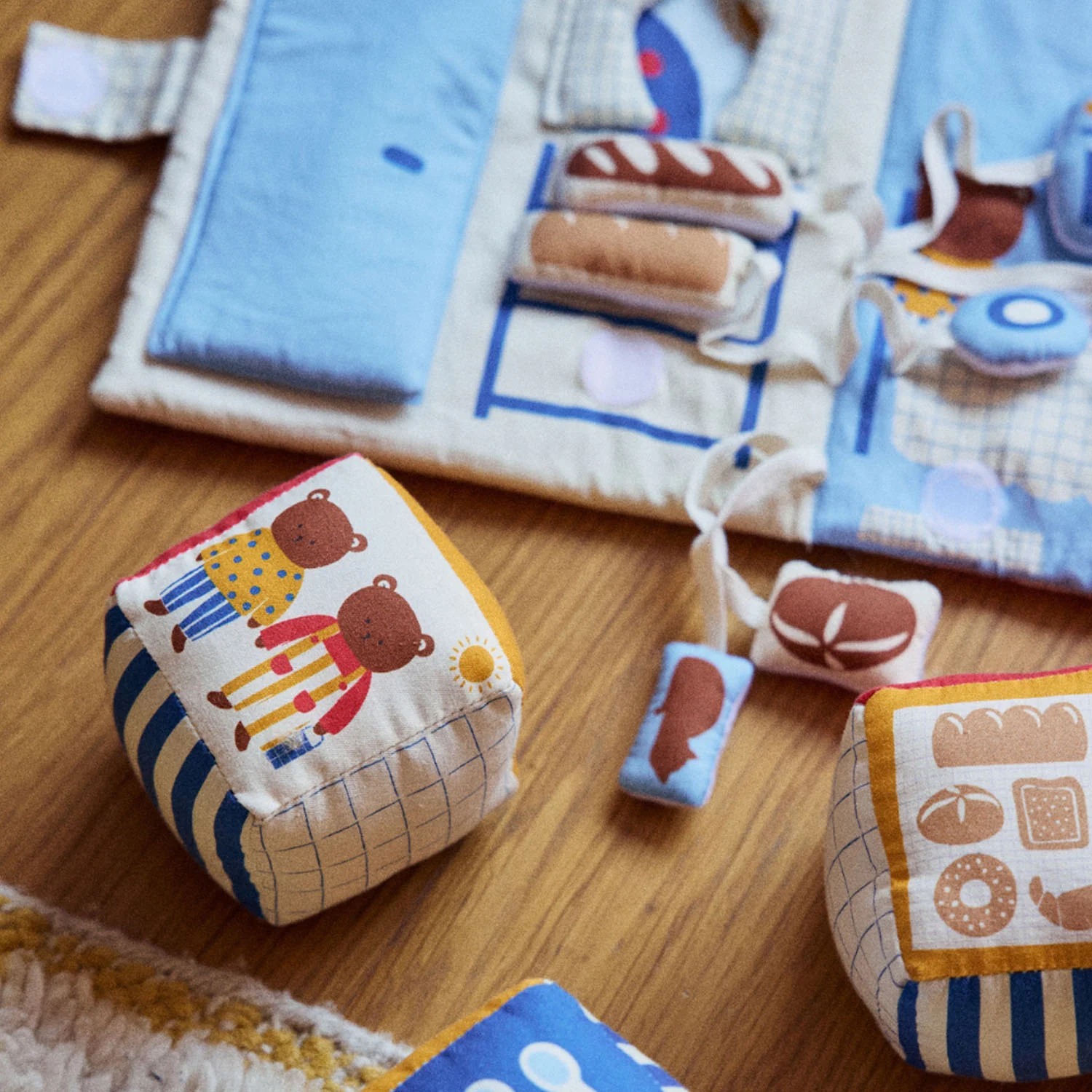 Ce lot de 3 cubes en tissu aux motifs oursons stimule l’éveil sensoriel et la motricité de bébé. Légers, colorés, faciles à attraper et à empiler, ils sont parfaits pour jouer en toute sécurité. Secouez-les pour entendre un doux son de hochet clochette. Livrés dans un joli pochon : pratique à emporter partout.