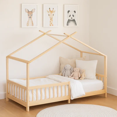 Le lit au sol bébé en forme de maisonnette devient immédiatement le point focal de la chambre, alliant fonctionnalité et esthétique.