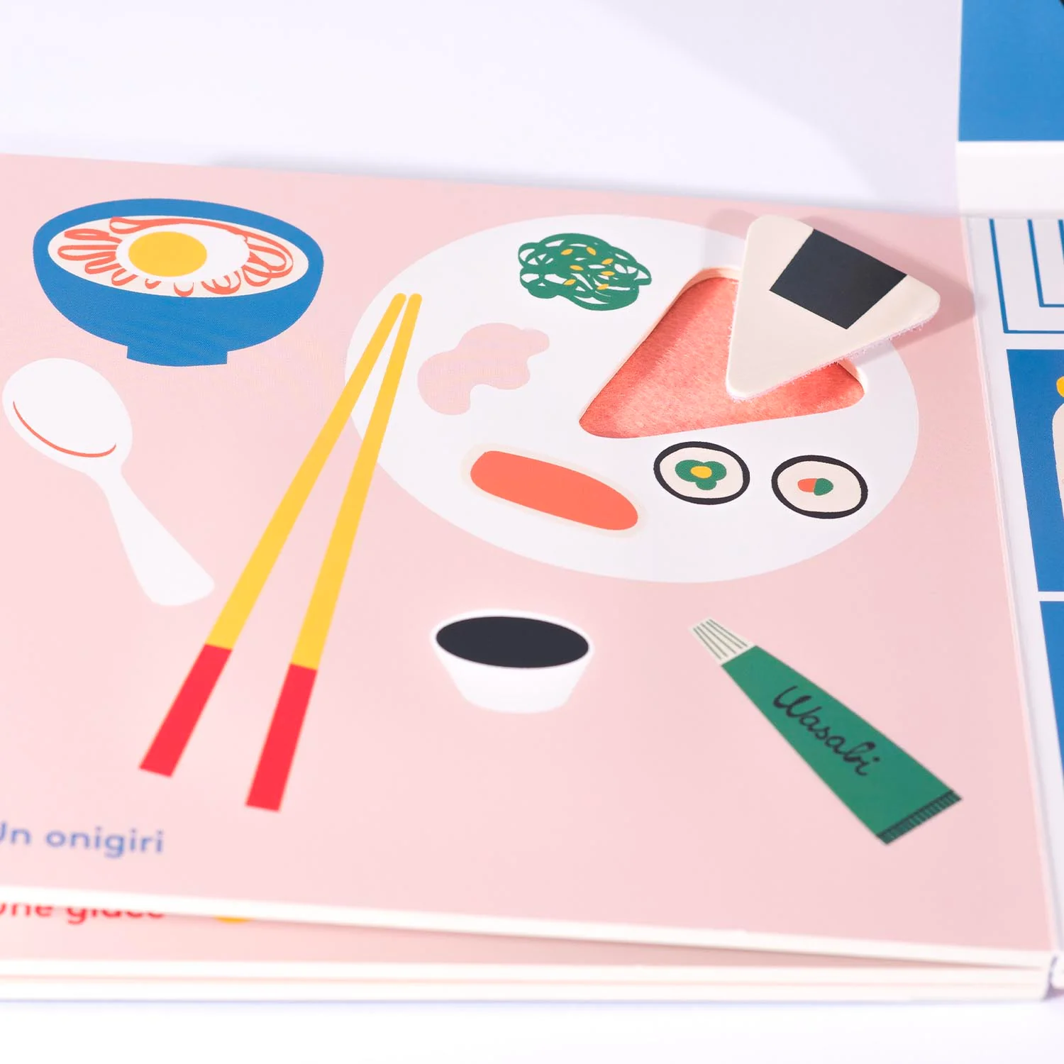A chaque page, l’enfant attrape un petit aliment découpé, et vient le déposer dans le ventre du loup. À la fin de la lecture, son ventre est rempli et le loup n’a plus faim.