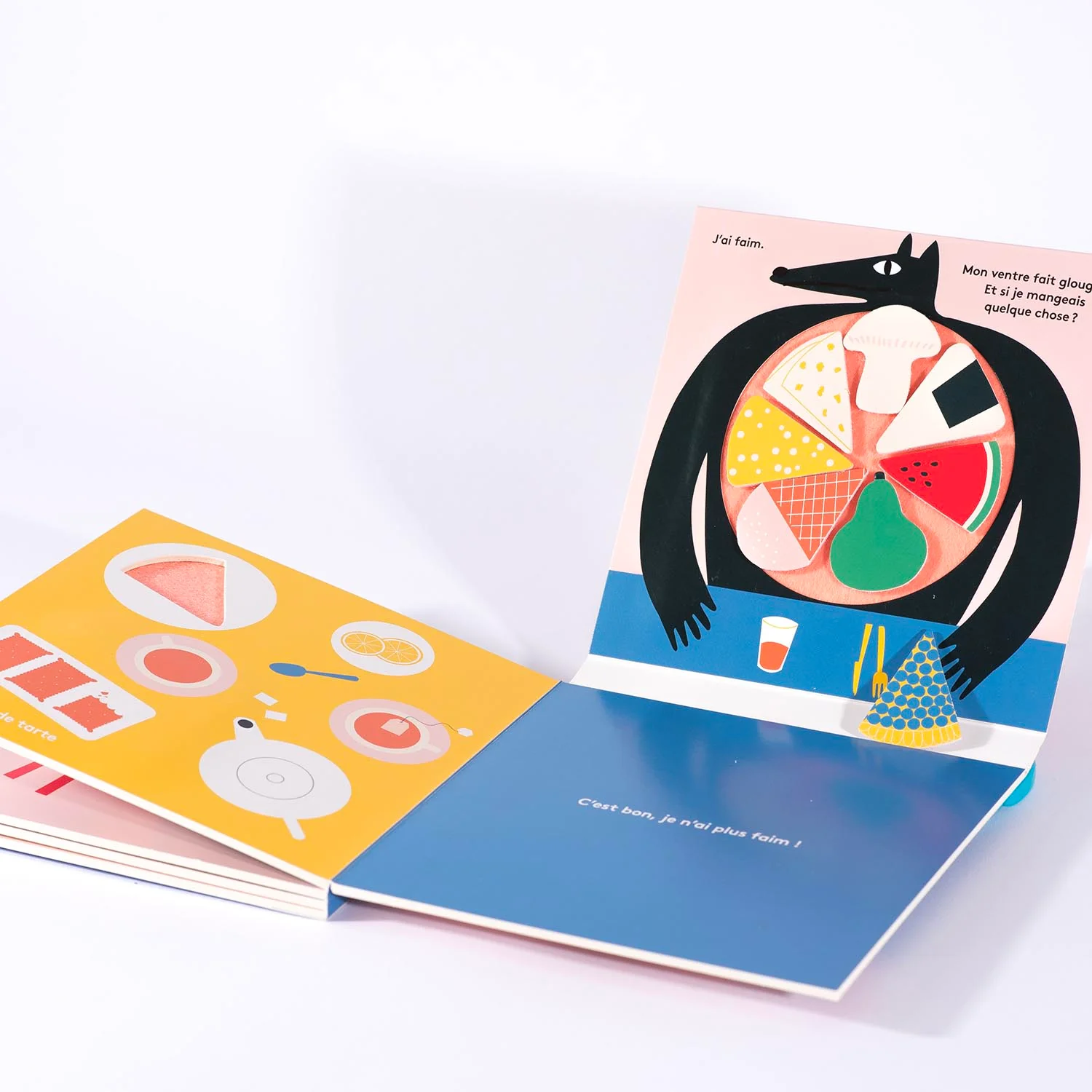L’estomac du loup fait glou-glou. C’est normal, il est complètement vide. Il a besoin de se rassasier… Sur le plan de travail d’une cuisine, il trouve un gros champignon, sur la nappe d’un pique-nique, une tranche de pastèque, dans un frigidaire, un morceau de gruyère, et sur la table d’un salon de thé, une part de tarte aux myrtilles…