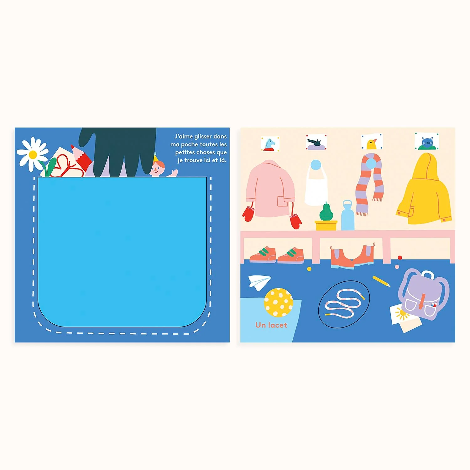 Loup adore glisser dans sa poche toutes les petites choses qu’il trouve ici et là. Ce sont ses petits trésors secrets. À l’école, il ramasse un lacet, sur la plage un coquillage, au parc des cailloux, dans la forêt une pomme de pin, sur le balcon une plume… Et quand sa poche est remplie, il aime admirer tous ses trésors. Un livre aux éditions L’Agrume.
