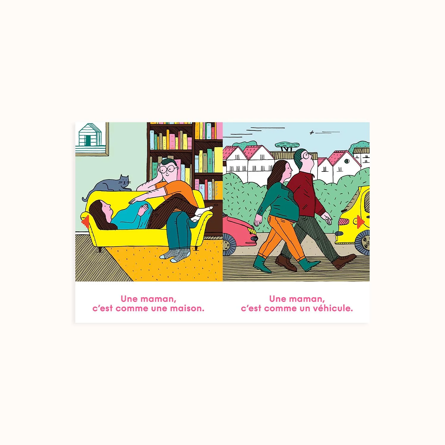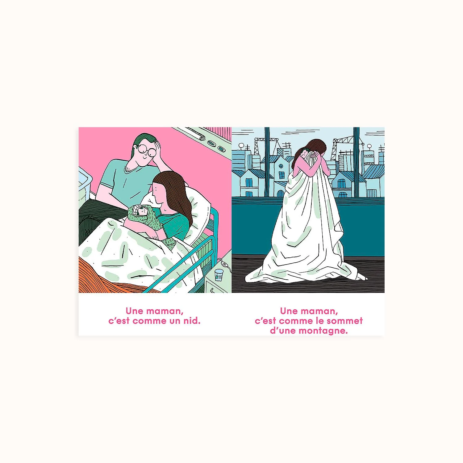 Une maman, c’est comme un nid, une maman, c’est comme un véhicule, une maman c’est comme une fontaine… A la manière d’une comptine, ces phrases courtes accompagnent chaque étape du quotidien d’un bébé. Au fil des pages l’enfant grandit et passe par différents apprentissages. Le lecteur suit l’enfant au fil de ces petits pas qui sont de grandes étapes pour lui. La maman qui était un nid, un refuge pour le nouveau-né devient une route, une histoire ou un spectacle pour l’enfant qui joue.