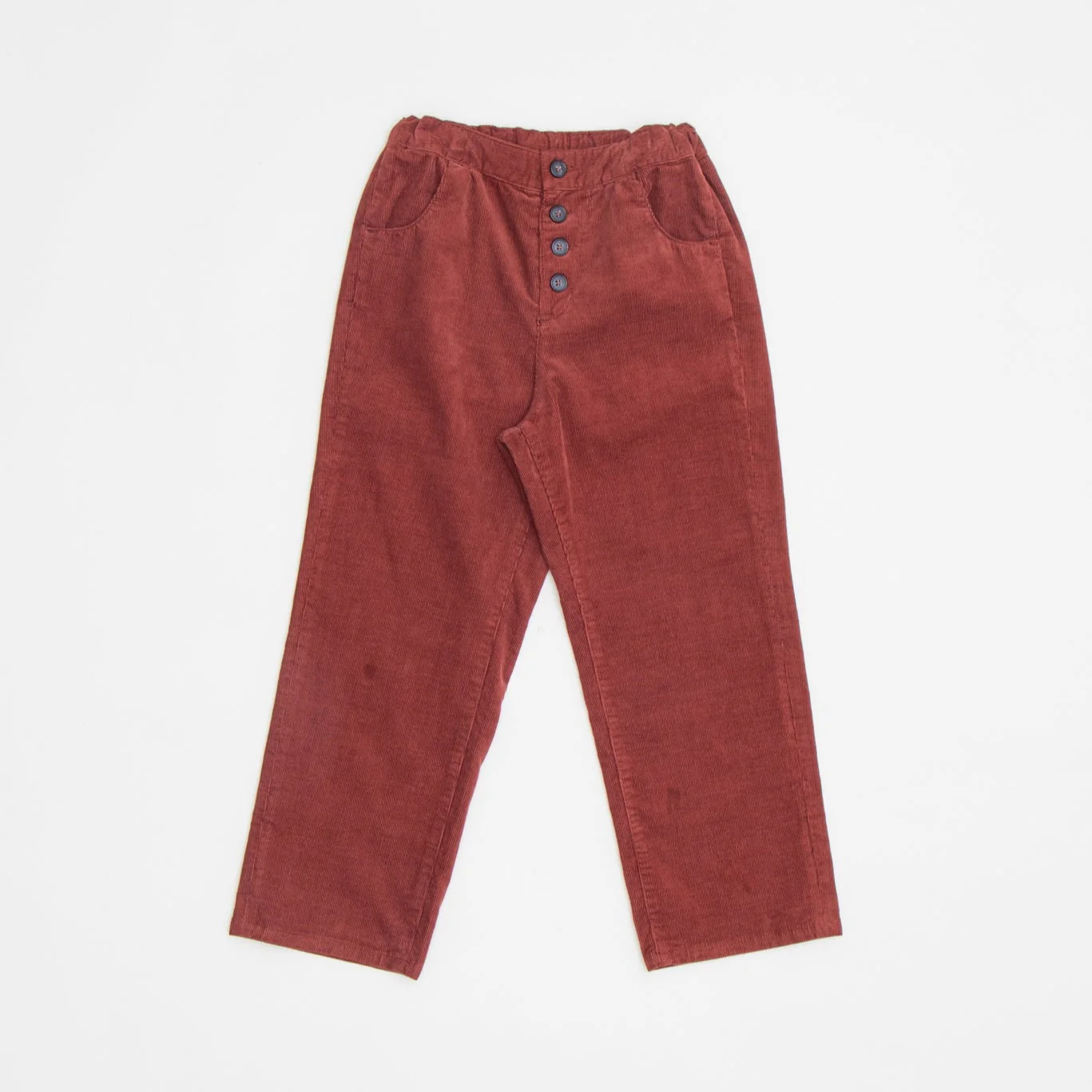 Le pantalon Erodium rust a des poches latérales rondes et une braguette boutonnée visible avec des poches plaquées à l’arrière.
