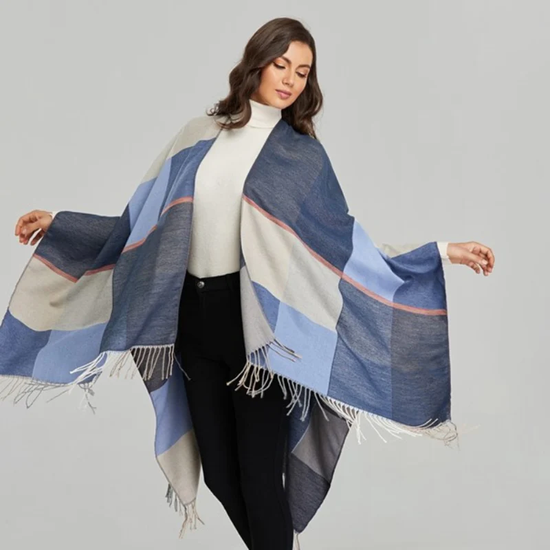 Poncho à franges bleu et beige pour femme