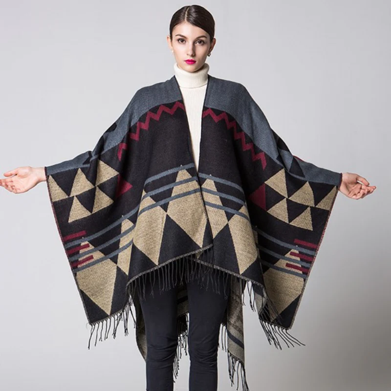 Poncho pour femme avec franges motifs géométriques