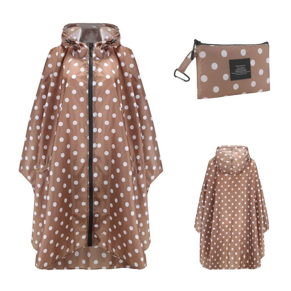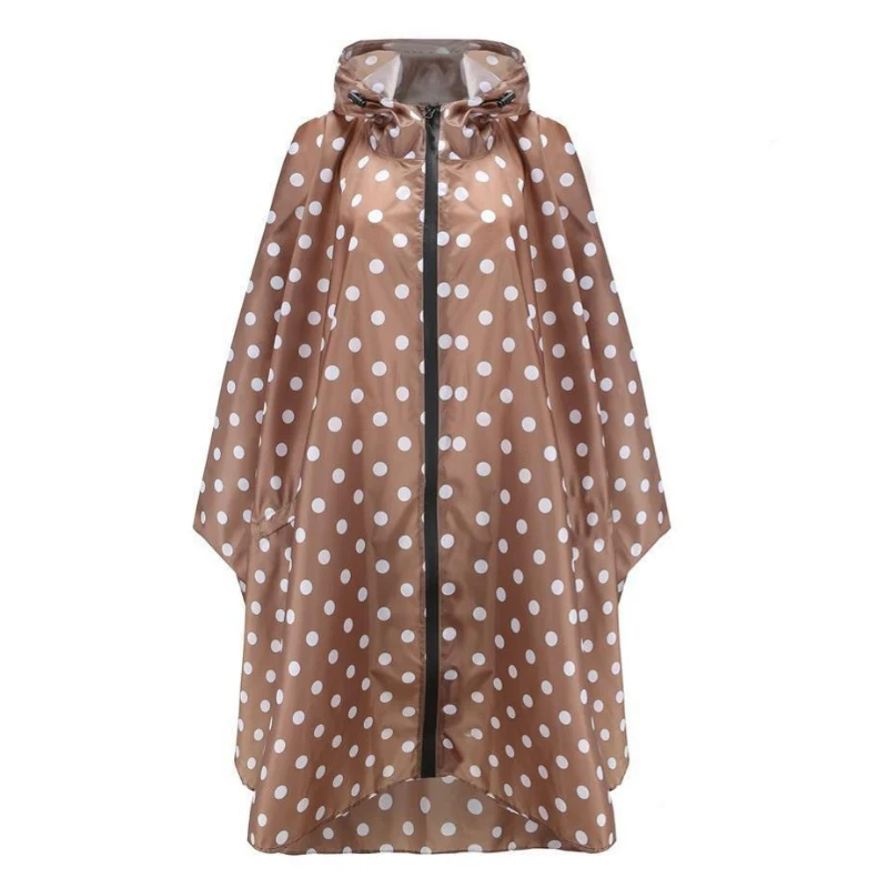 Craquez pour le style chic de ce long poncho de pluie pour femme marron à pois blancs. Aucune goutte d’eau ne traversera cette cape de pluie fabriquée à partir d’un tissu étanche en fibres de polyester. En plus de rester au sec, vous serez protégée du froid grâce à l’effet coupe-vent de cette élégante veste de pluie. Une pochette de rangement assortie est offerte avec ce poncho imperméable pour en faciliter le transport.