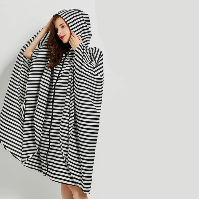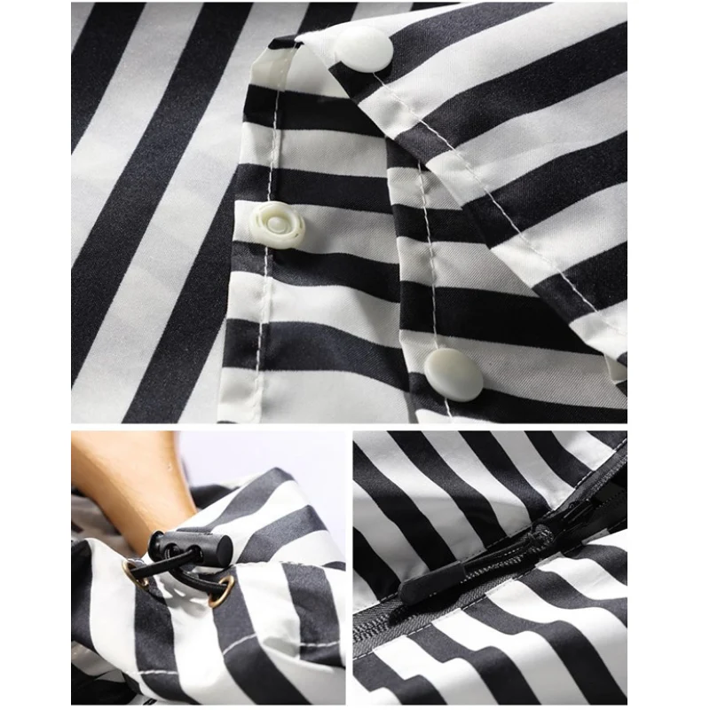 Mettez-vous à l’abri en enfilant ce ravissant poncho de pluie à rayures noires et blanches ! Accessoire de mode à part entière, cette cape s’enfile en un rien de temps si vous vous faites surprendre par une averse. Elle est fabriquée dans une matière écologique et imperméable et vous protégera parfaitement de la pluie.