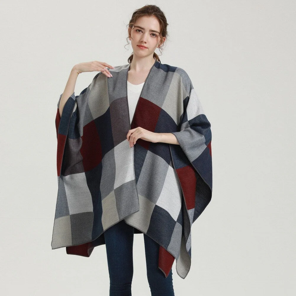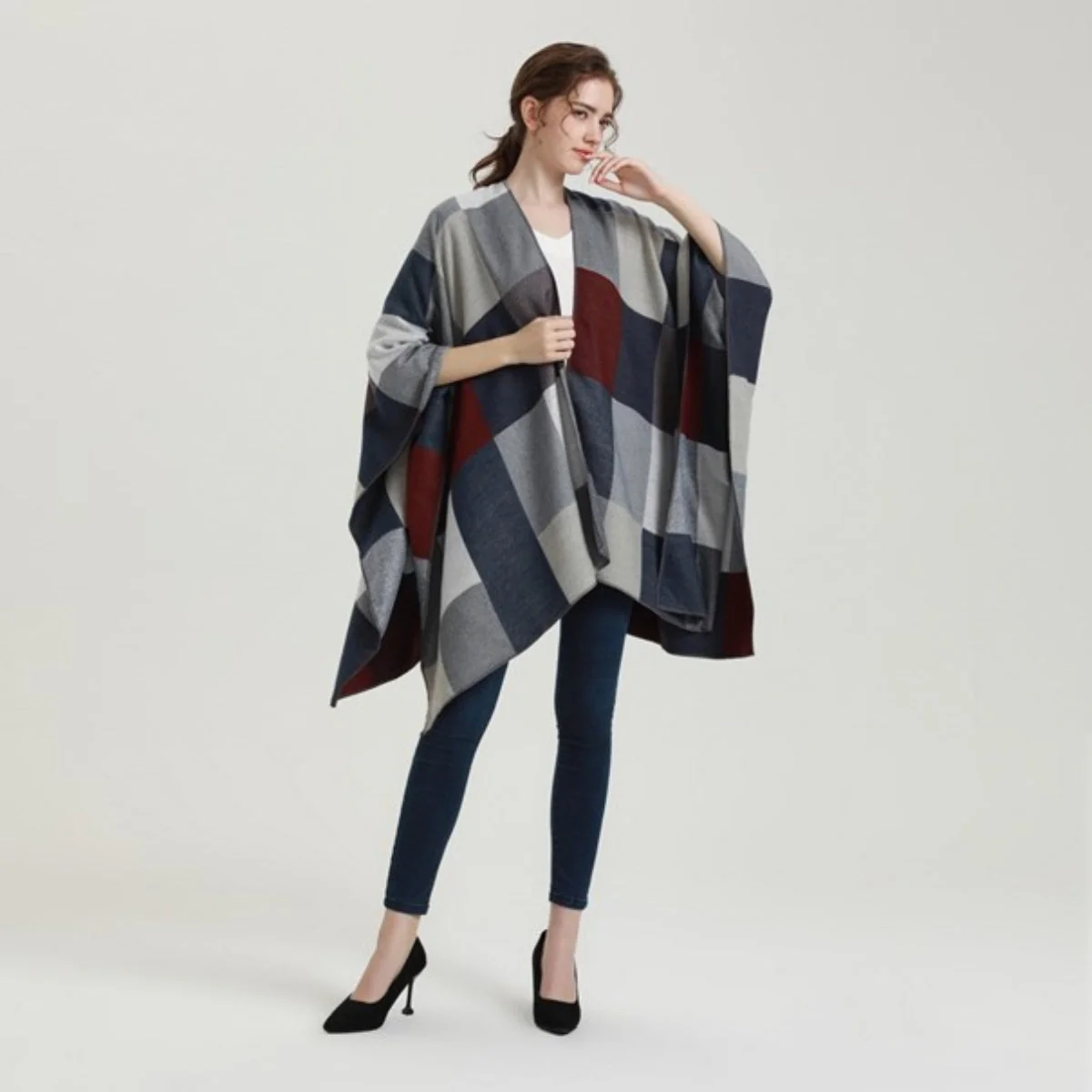 Ce poncho contemporain pour femme arbore un motif audacieux de grands carreaux, fusionnant style classique et touche moderne. Confectionné dans un tissu léger et doux, il enveloppe élégamment la silhouette. Ses tons subtils s’harmonisent avec diverses tenues. Des lignes épurées et une encolure fluide ajoutent une touche chic et décontractée. Parfait pour les journées fraîches, ce poncho combine confort et esthétique, faisant de lui un accessoire polyvalent pour les femmes soucieuses de leur style, prêtes à affronter les éléments avec panache.
