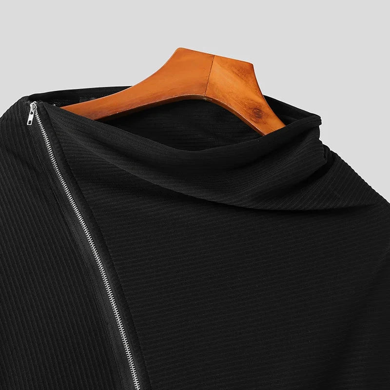 Ajoutez une touche d’élégance contemporaine à votre garde-robe avec ce poncho pour homme au design unique. Confectionné dans un tissu noir texturé de haute qualité, il combine confort et style avec brio. Sa coupe asymétrique offre une silhouette moderne et fluide, tandis que la fermeture zippée diagonale argentée ajoute une touche audacieuse et fonctionnelle. Idéal pour les journées fraîches, ce poncho se distingue par son col drapé qui protège délicatement le cou, tout en ajoutant un charme sophistiqué.