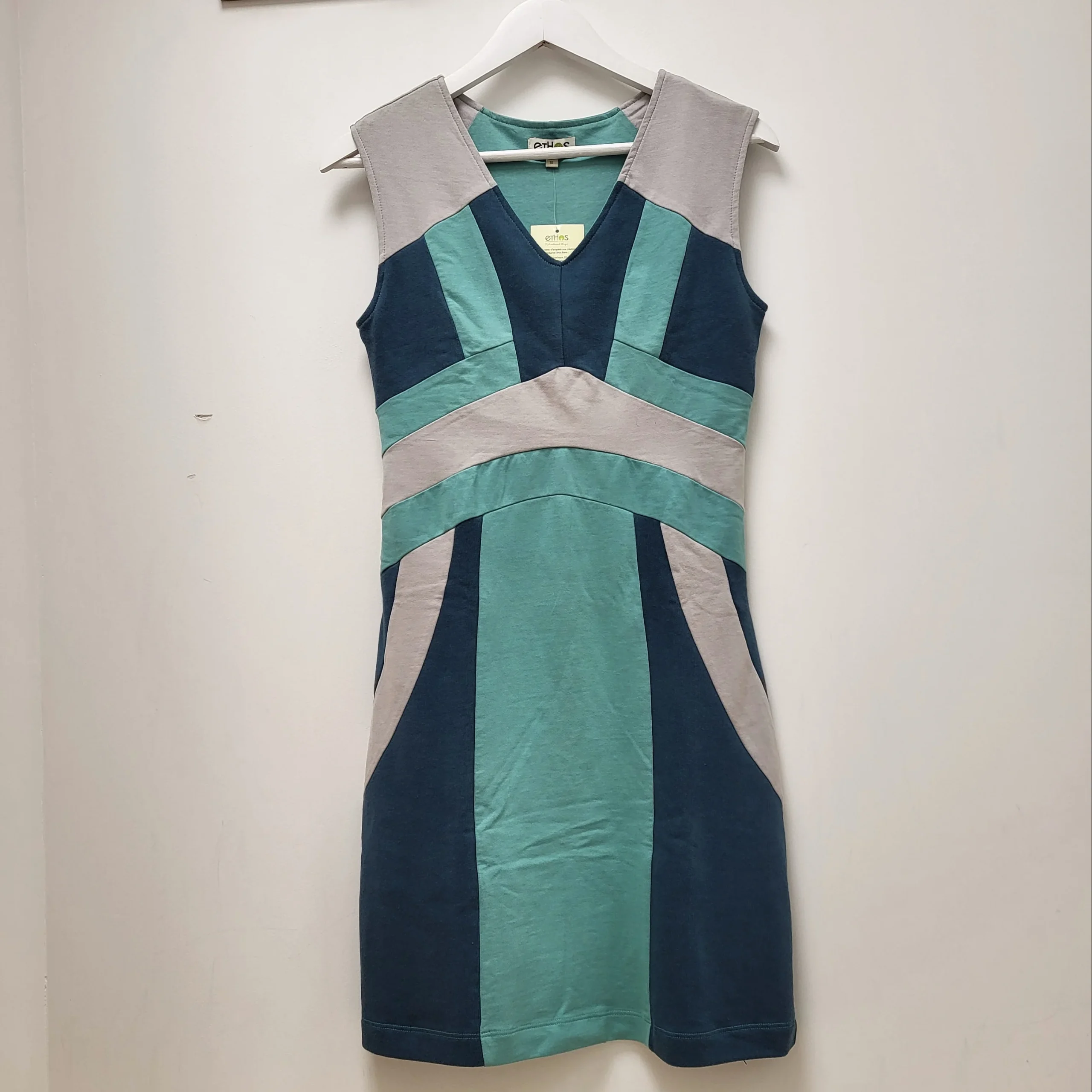 Robe à empiècements dans les tons bleus et gris col V Sans manches Près du corps et légèrement évasée aux cuisses Longueur genoux Petite fente au milieu dos 100% coton biologique grammage type sweatshirt Fabriquée en Inde GOTS