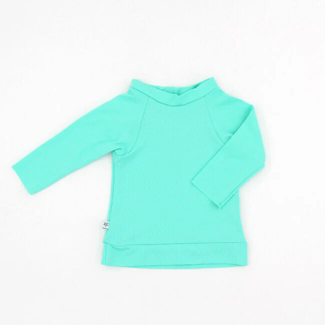 T-shirt anti-UV à manches longues pour les enfants d’un an qui protège la peau de bébé des effets nocifs des UV du soleil, dans l’eau et hors de l’eau.