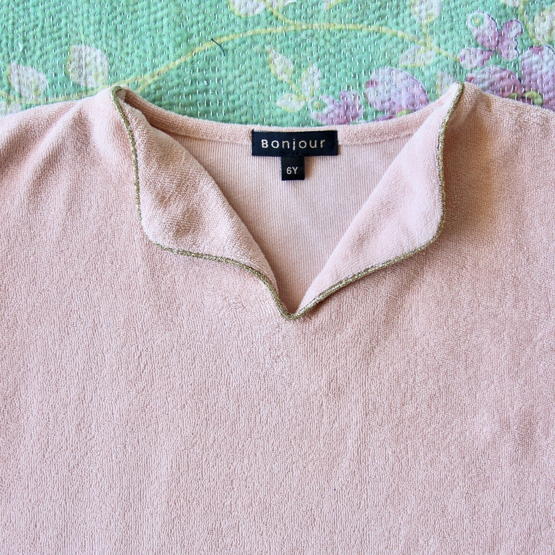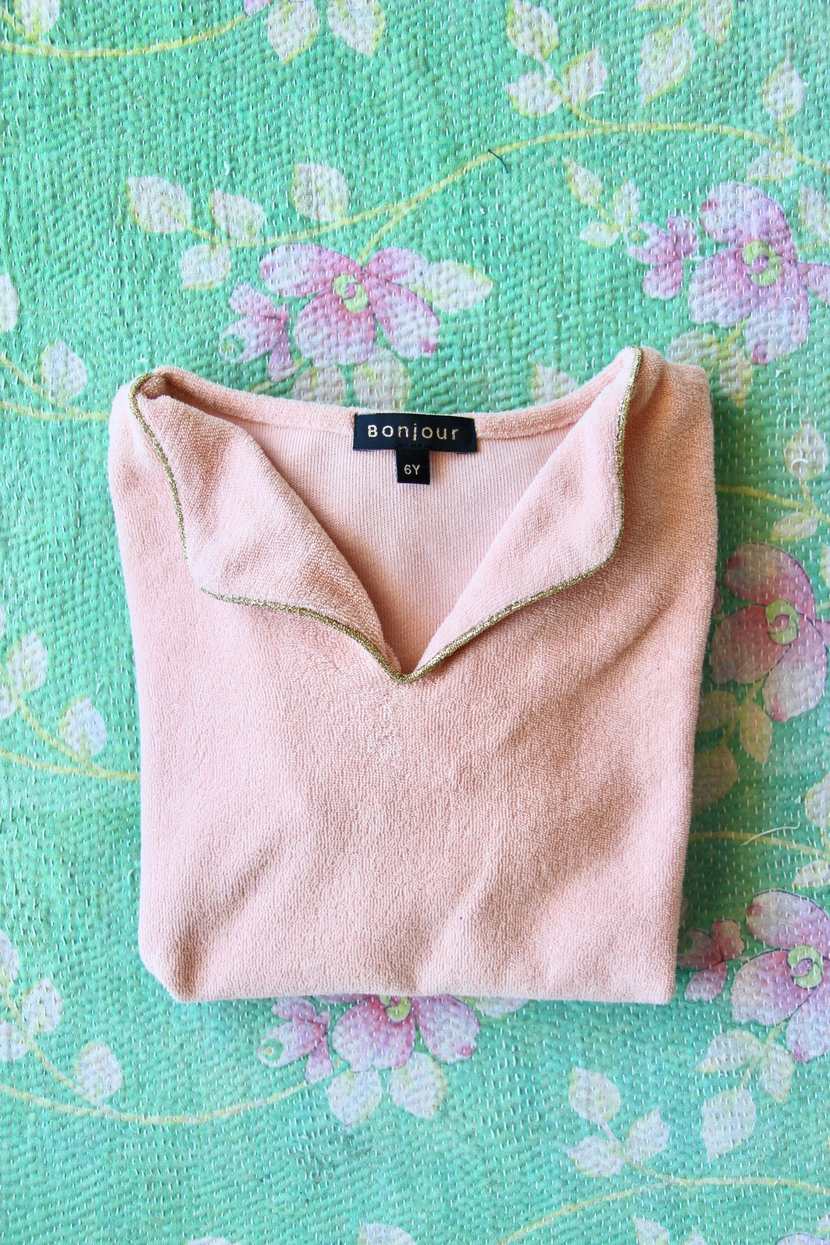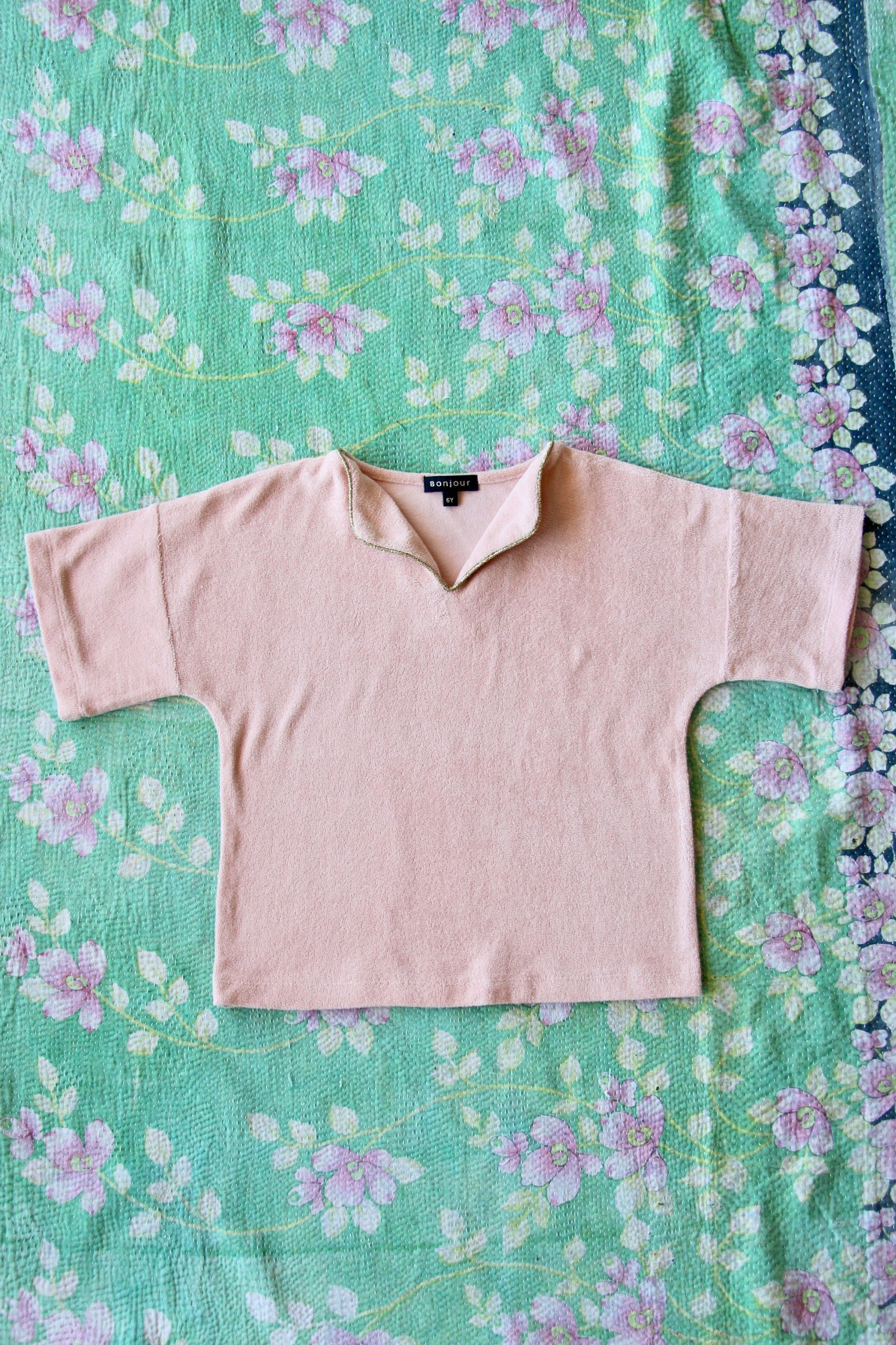 T-SHIRT EPONGE ROSE BONJOUR Matière : EpongeDétails : Passepoil doré autour du colComposition : 100% cotonFabriqué en Inde