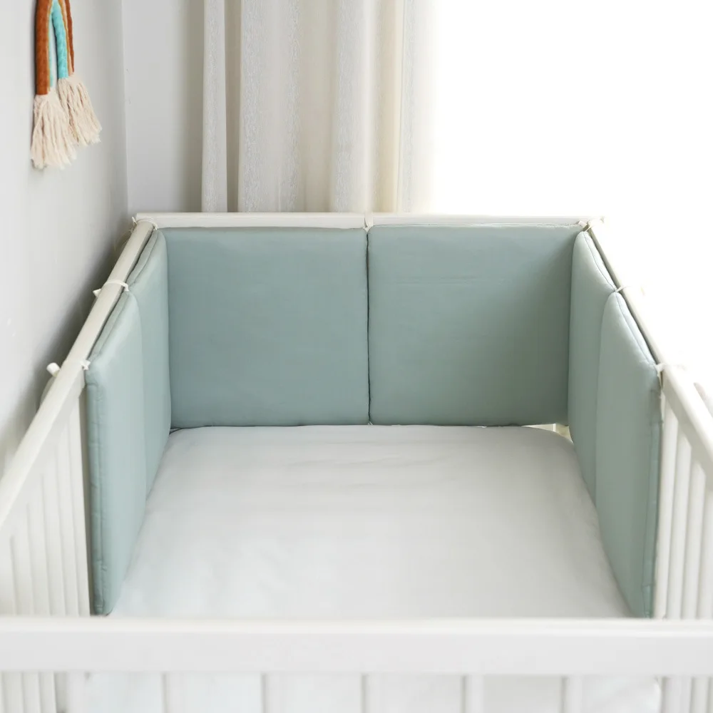Ce tour de lit bébé de couleur verte crée une barrière moelleuse qui limite les heurts et les coincements, tout en adoucissant l’ambiance visuelle.